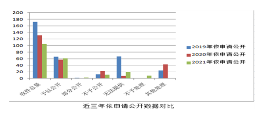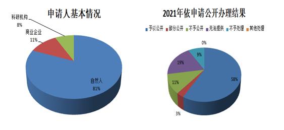 2021年度,全區(qū)共辦理政府信息公開申請(qǐng)105件(政府層面的申請(qǐng)16件),其中自然人申請(qǐng)85件,商業(yè)企業(yè)申請(qǐng)12件,科研機(jī)構(gòu)申請(qǐng)8件。申請(qǐng)內(nèi)容主要集中在集體土地征地、國(guó)有土地上房屋征收、城鄉(xiāng)規(guī)劃、社會(huì)保障等領(lǐng)域。共作出政府信息公開申請(qǐng)答復(fù)書105件,其中予以公開61件,占58.10%;部分公開3件,占2.86%;不予公開12件,占11.43%;無法提供的申請(qǐng)20件,占19.05%;信訪投訴類等不予處理9件,占8.57%。