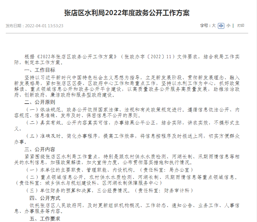 4.2022年我局嚴(yán)格按照《2022年淄博市張店區(qū)政務(wù)公開工作方案》要求,細(xì)化每項(xiàng)任務(wù)目標(biāo),制定切實(shí)可行的工作措施,按照時(shí)間節(jié)點(diǎn)認(rèn)真細(xì)致地做好信息公開,確保了方案各項(xiàng)工作落地落實(shí)。