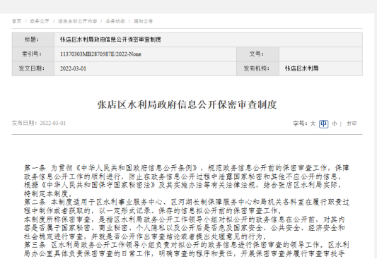 (三)政府信息管理。一是在《張店區(qū)人民政府信息主動(dòng)公開(kāi)目錄》的基礎(chǔ)上,結(jié)合本單位職能,印發(fā)了《張店區(qū)水利局信息主動(dòng)公開(kāi)基本目錄》,以條目形式逐項(xiàng)細(xì)化分類(lèi),明確事項(xiàng)名稱(chēng)、公開(kāi)內(nèi)容和公開(kāi)主體等,形成了公開(kāi)事項(xiàng)清單,讓社會(huì)群眾對(duì)本單位公開(kāi)事項(xiàng)一目了然。二是加強(qiáng)政府信息公開(kāi)保密審查工作的制度化、常態(tài)化、規(guī)范化建設(shè),制定了《張店區(qū)水利局政府信息公開(kāi)保密審查制度》,將政府信息公開(kāi)保密審查與公文運(yùn)轉(zhuǎn)、信息發(fā)布結(jié)合起來(lái),防止保密審查與政府信息公開(kāi)工作脫節(jié)。三是做好主動(dòng)公開(kāi)內(nèi)容更新維護(hù),加強(qiáng)預(yù)警信息公開(kāi),2023年汛期共公開(kāi)雨情信息8條,為市民生活生產(chǎn)、日常出行等提供決策依據(jù)。同時(shí)對(duì)本單位領(lǐng)導(dǎo)信息變動(dòng)、政策文件發(fā)布、行政執(zhí)法信息、部門(mén)會(huì)議等重要信息進(jìn)行了實(shí)時(shí)更新。