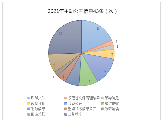 2021年1月1日至2021年12月31日,我中心主動(dòng)公開信息43條(次)。其中公開政策文件8條、規(guī)范性文件清理結(jié)果1條、領(lǐng)導(dǎo)信息1條、規(guī)劃計(jì)劃2條、會(huì)議公開6條、建議提案4條、財(cái)政信息3條、重點(diǎn)領(lǐng)域信息公開2條、政策解讀1條、回應(yīng)關(guān)切4條、業(yè)務(wù)動(dòng)態(tài)11條。
