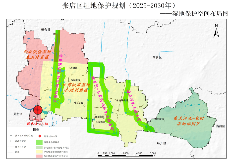 在此背景下,淄博市自然資源和規(guī)劃局張店分局組織編制了《張店區(qū)濕地保護規(guī)劃(2025—2030年)》(以下簡稱《規(guī)劃》)?!兑?guī)劃》主要包括背景分析、總體要求、空間布局、重點任務、環(huán)境影響評價、保障措施等內(nèi)容,明確了全區(qū)濕地保護目標和指標體系,提出了“一核引領、三帶貫通、三區(qū)協(xié)同、多節(jié)點鑲嵌”的濕地保護空間格局,規(guī)劃了濕地保護和修復重點工程,是指導當前和今后一個時期張店區(qū)濕地保護工作的綱領性文件。